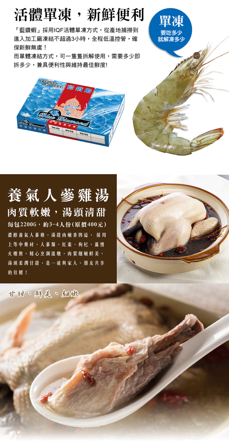 大姊廚房年菜精選~養生吉祥套餐《藍鑽蝦+花枝丸+醉雞腿+黑胡椒毛豆莢+人篸雞湯》